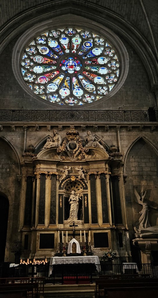 This Gothic-style cathedral towered over the small homes in the immediate area, and there was some active construction underway blocking the entrance. I was able to follow another family on their own walking tour through a gate and over to a well-hidden side entrance, which allowed us into the quiet church. I read that the oldest medieval glass window inside dates back to 1165 – quite impressive!