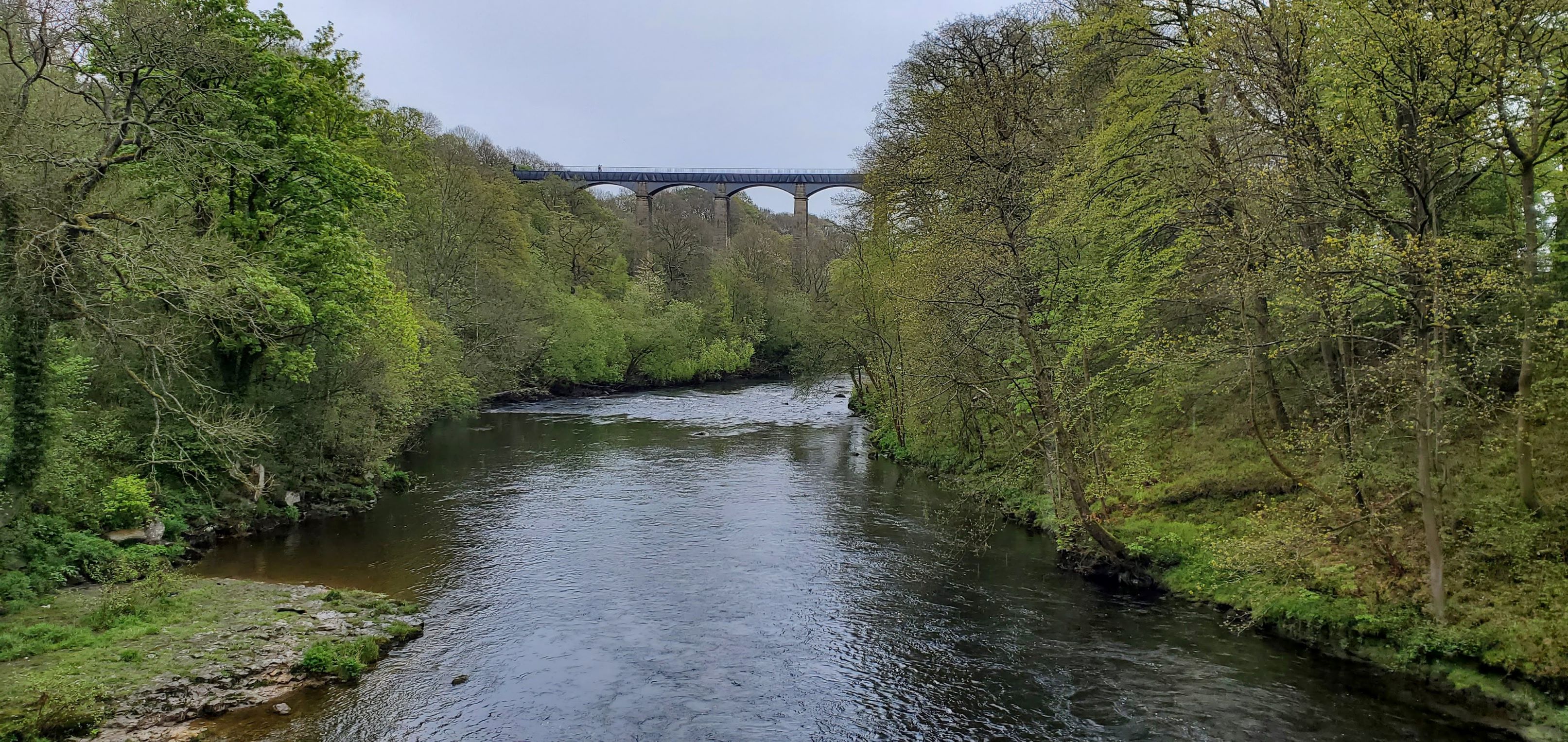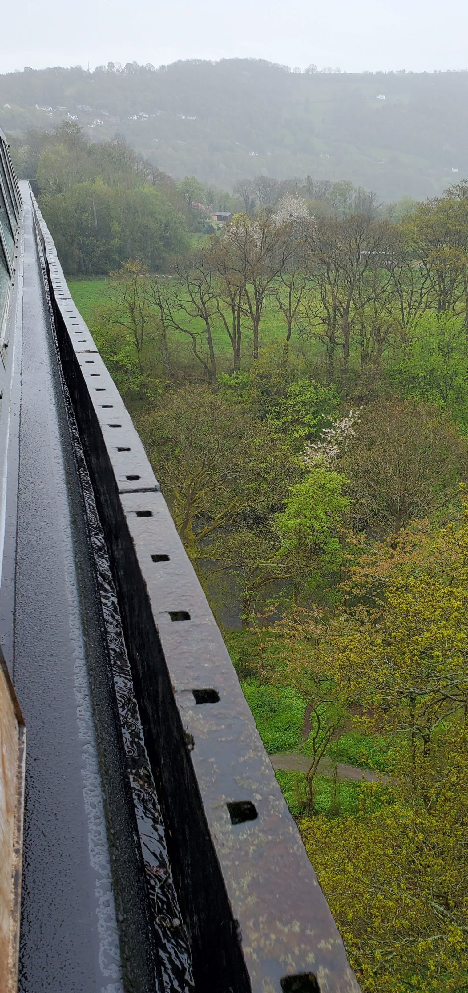 One of the more unusual experiences of our recent trip to Europe occurred our first day in Wales. We rode in a very skinny boat across an aqueduct 126 feet in the air looking straight over the edge of the water to the river below!