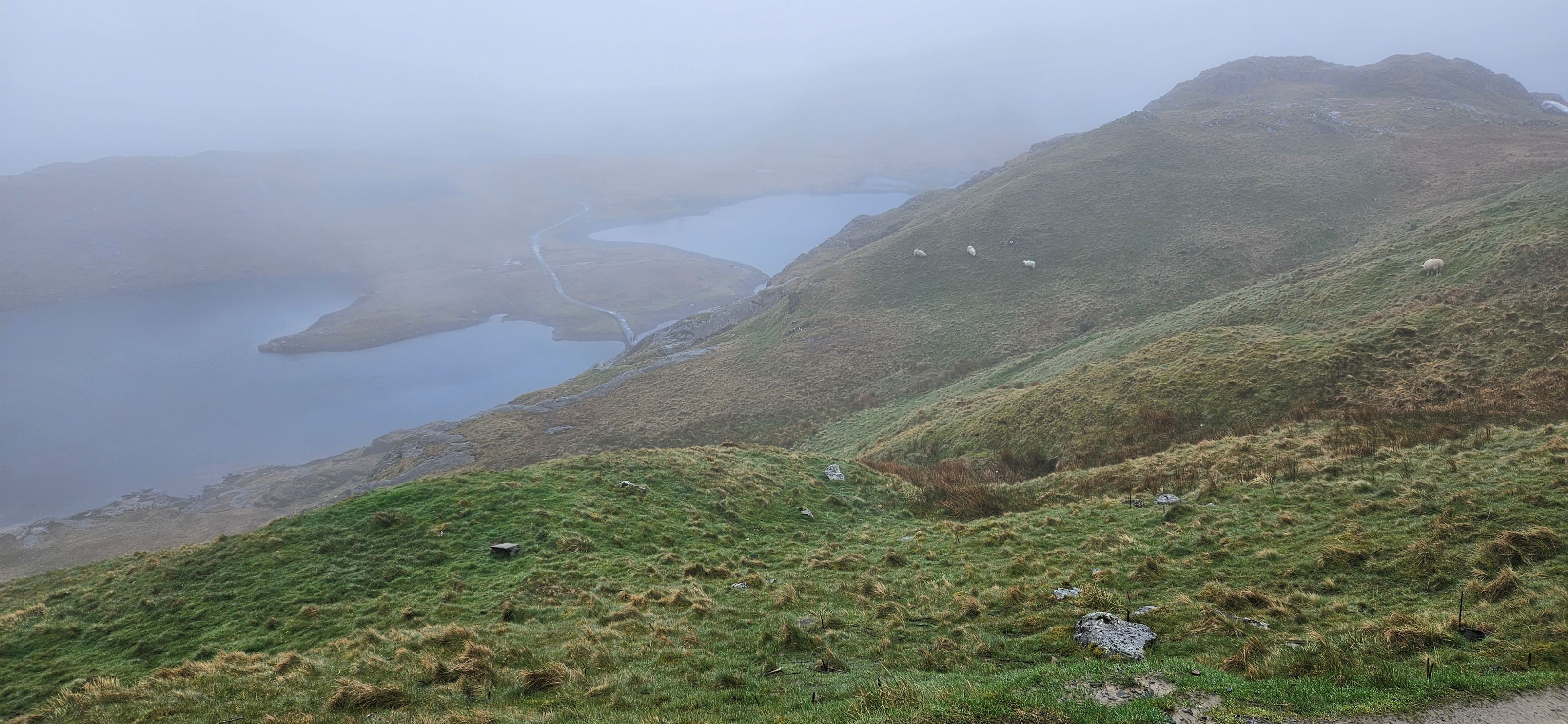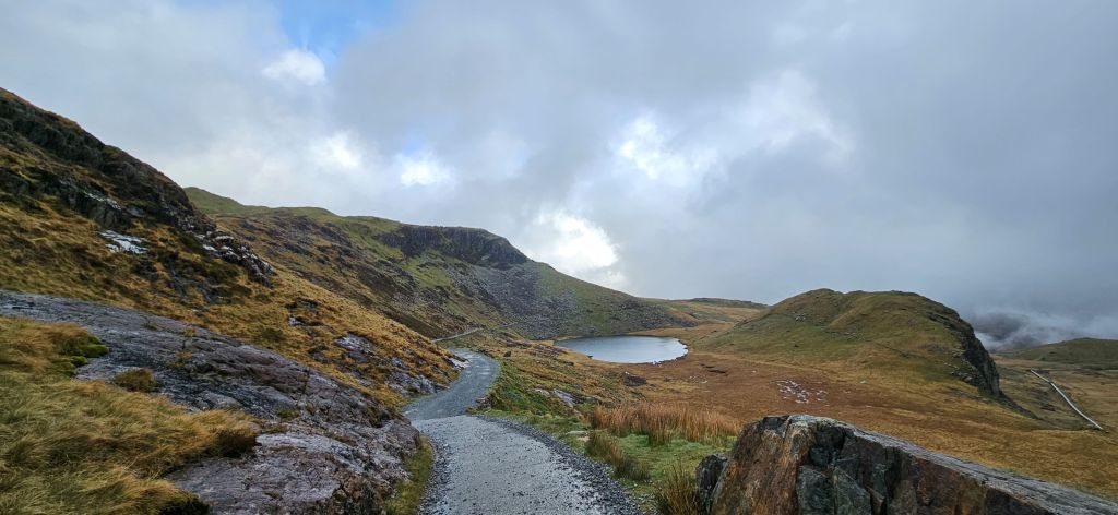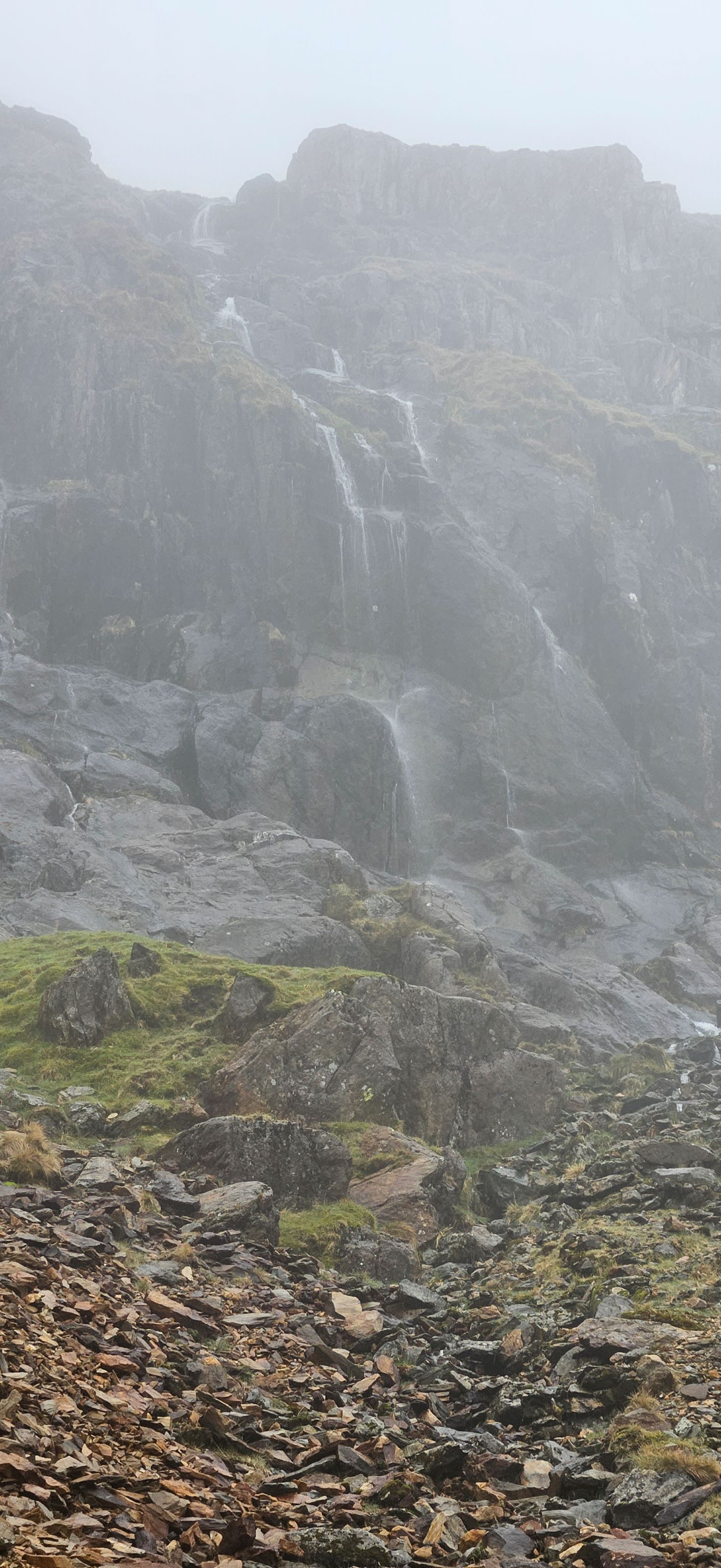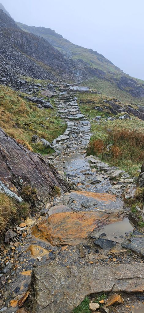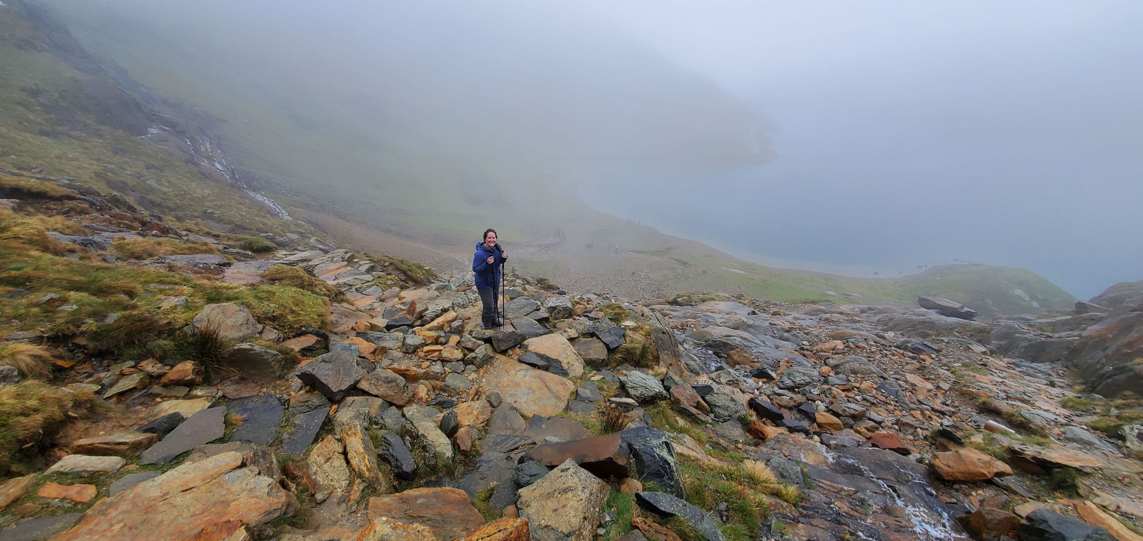 Our visibility began to improve as we scrambled farther away from the summit. Soon we were climbing past hidden waterfalls and finally we were walking the relatively flat portion of the Miner’s Track along Llyn Llydaw (the large lake).