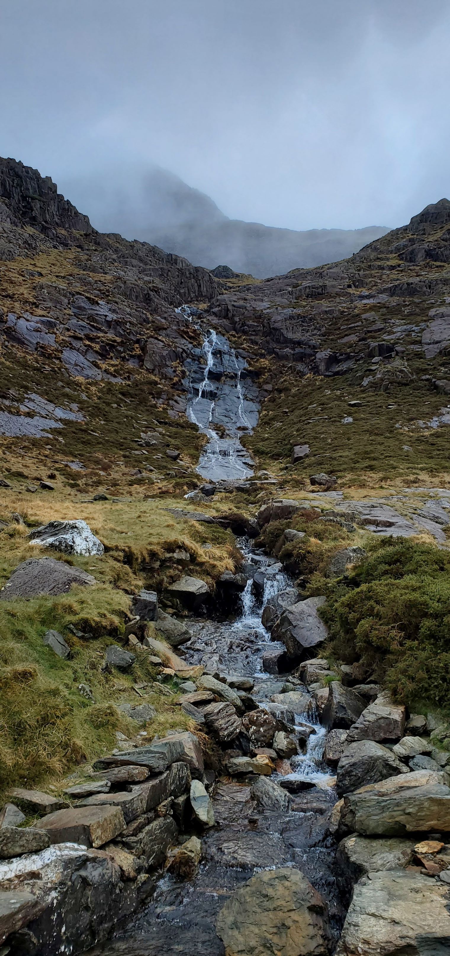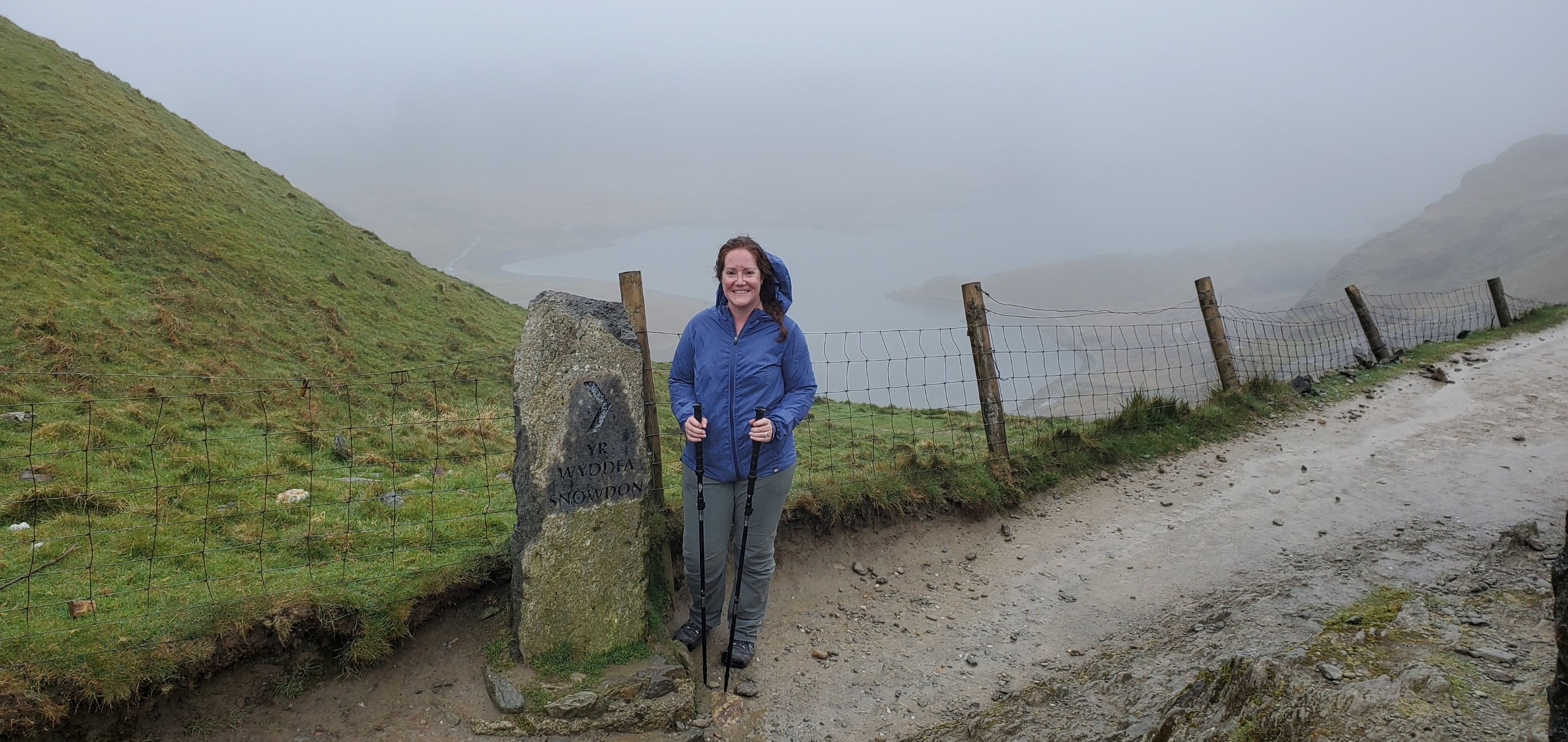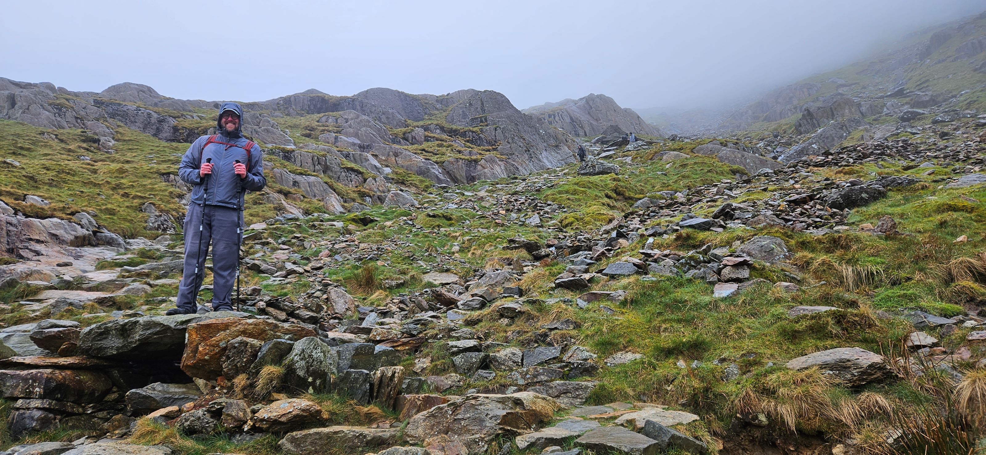 Our visibility began to improve as we scrambled farther away from the summit. Soon we were climbing past hidden waterfalls and finally we were walking the relatively flat portion of the Miner’s Track along Llyn Llydaw (the large lake).