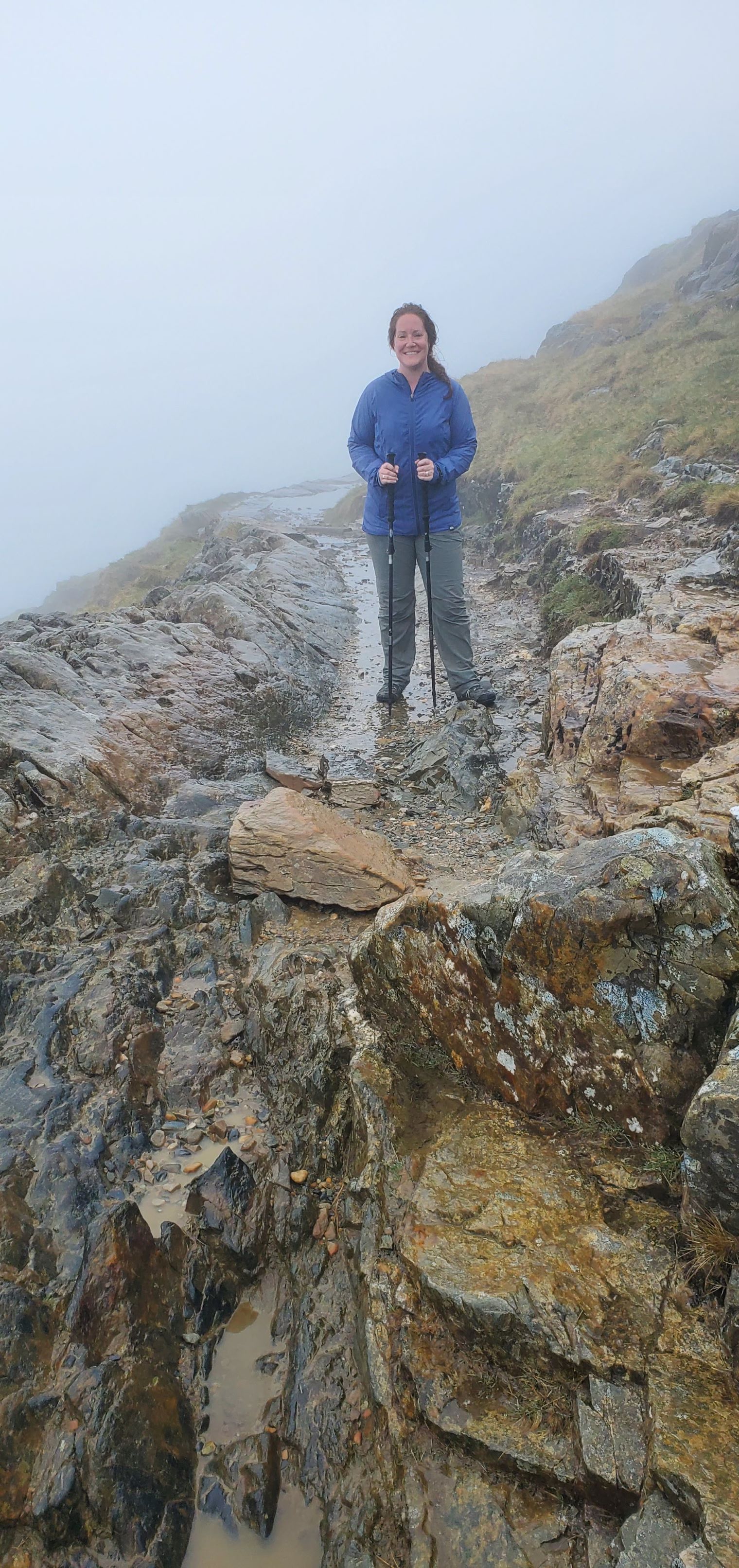 None of us could find the stone marker (among all of the other stones!) indicating which way to go, but we managed to follow Brian’s Gaia app to what appeared to be our path down toward the lakes. As you can see in the picture of me below, it was hard to tell which stones were just stones and which ones were meant to be the trail!