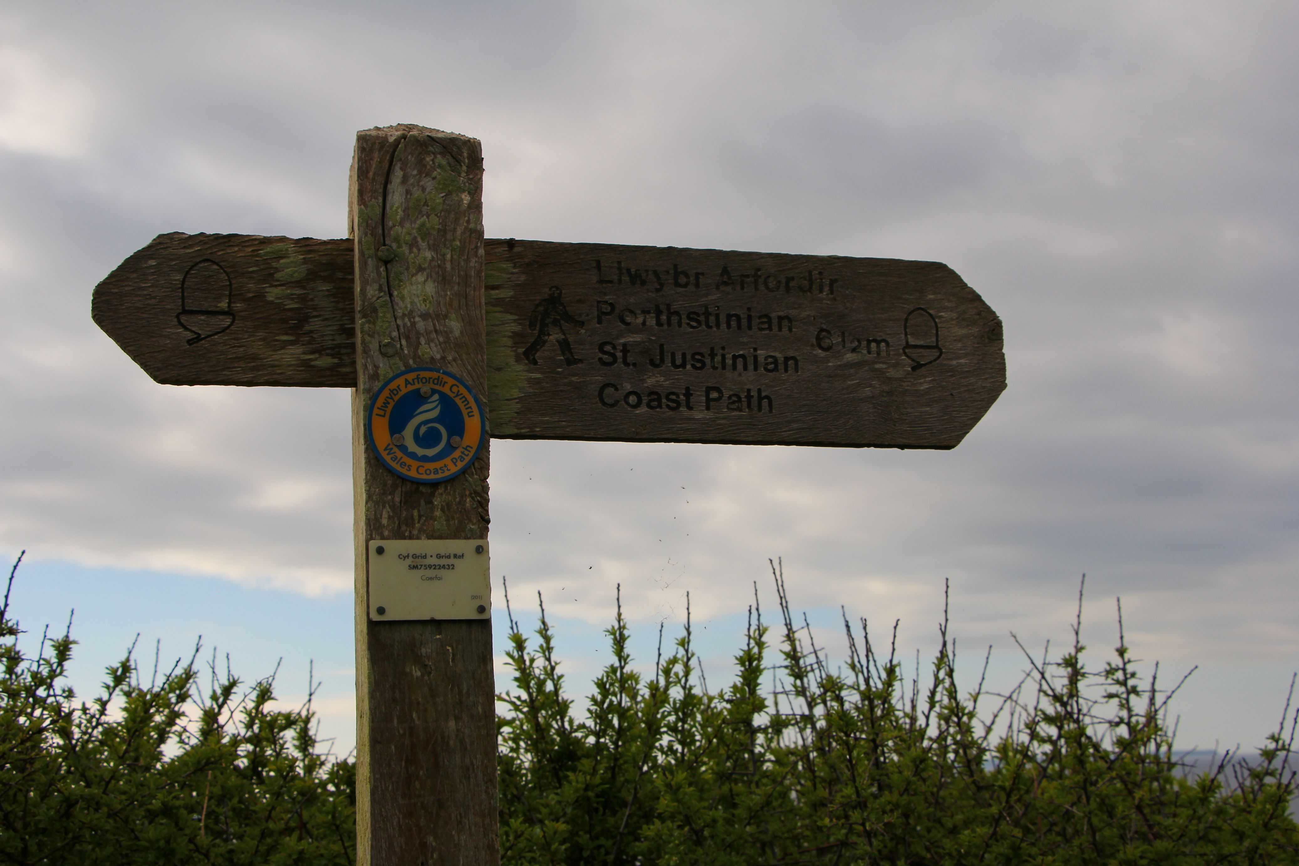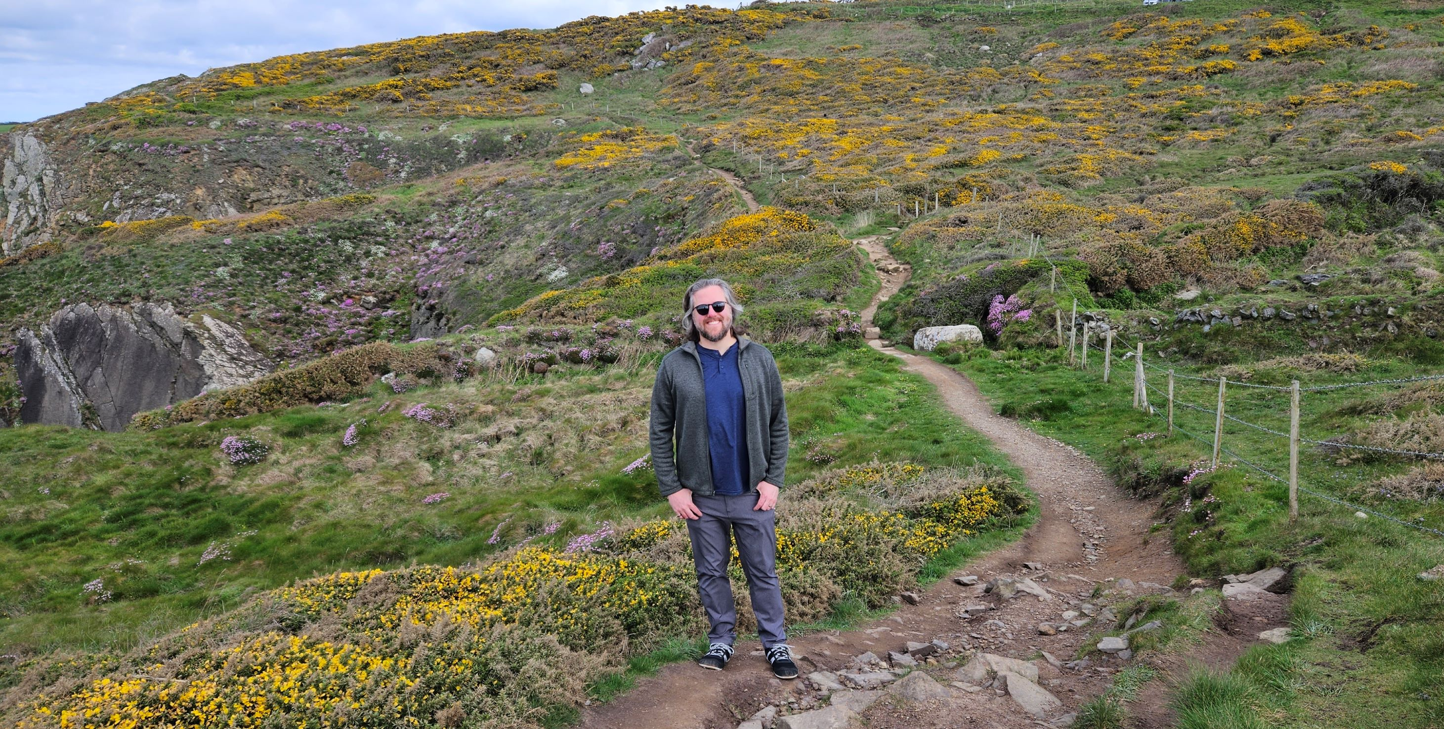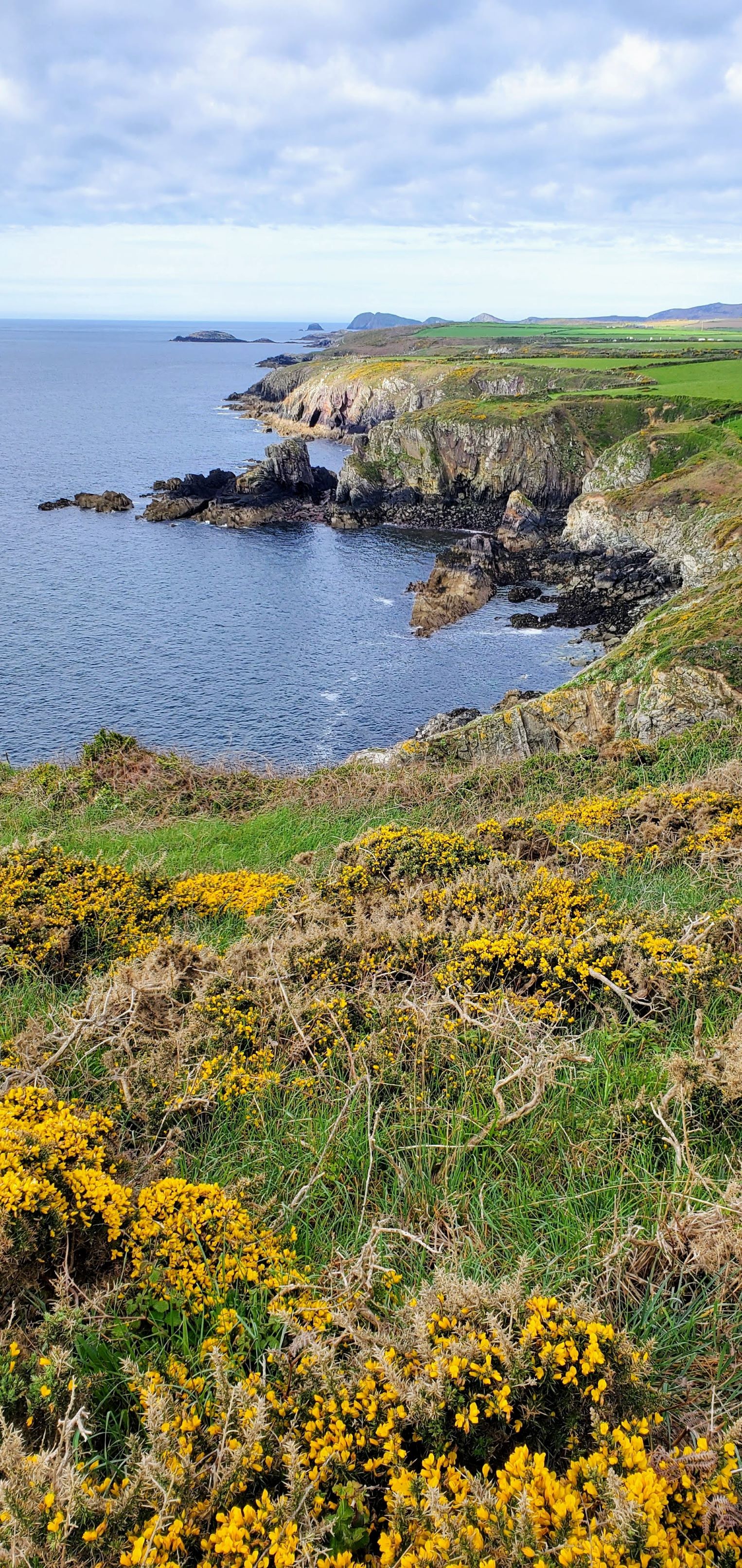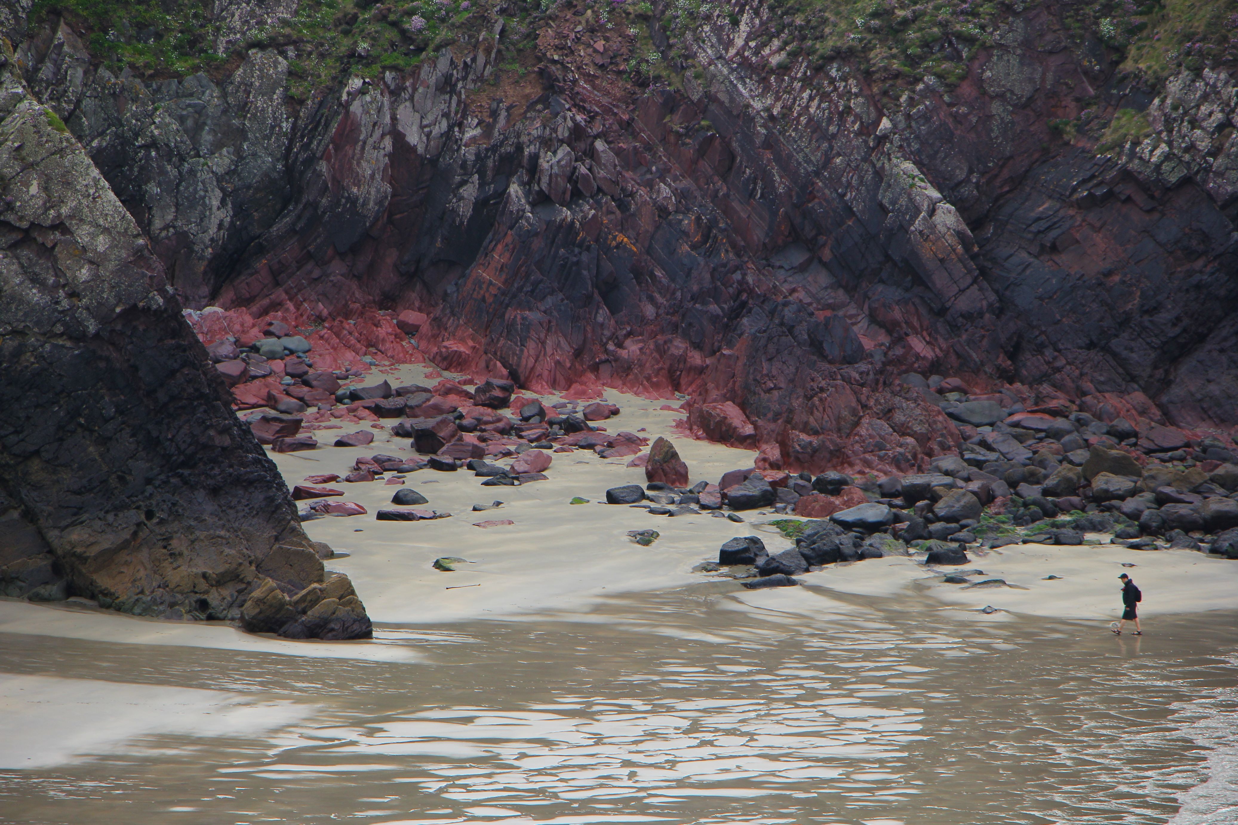 Brian discovered St. Justinian’s Coastal Walk, a 3.9-mile loop trail not far from where we were staying, so we checked part of it out one morning. We started at Caerfai Beach, admiring the red and purple cliffs before walking along the narrow coastal path.