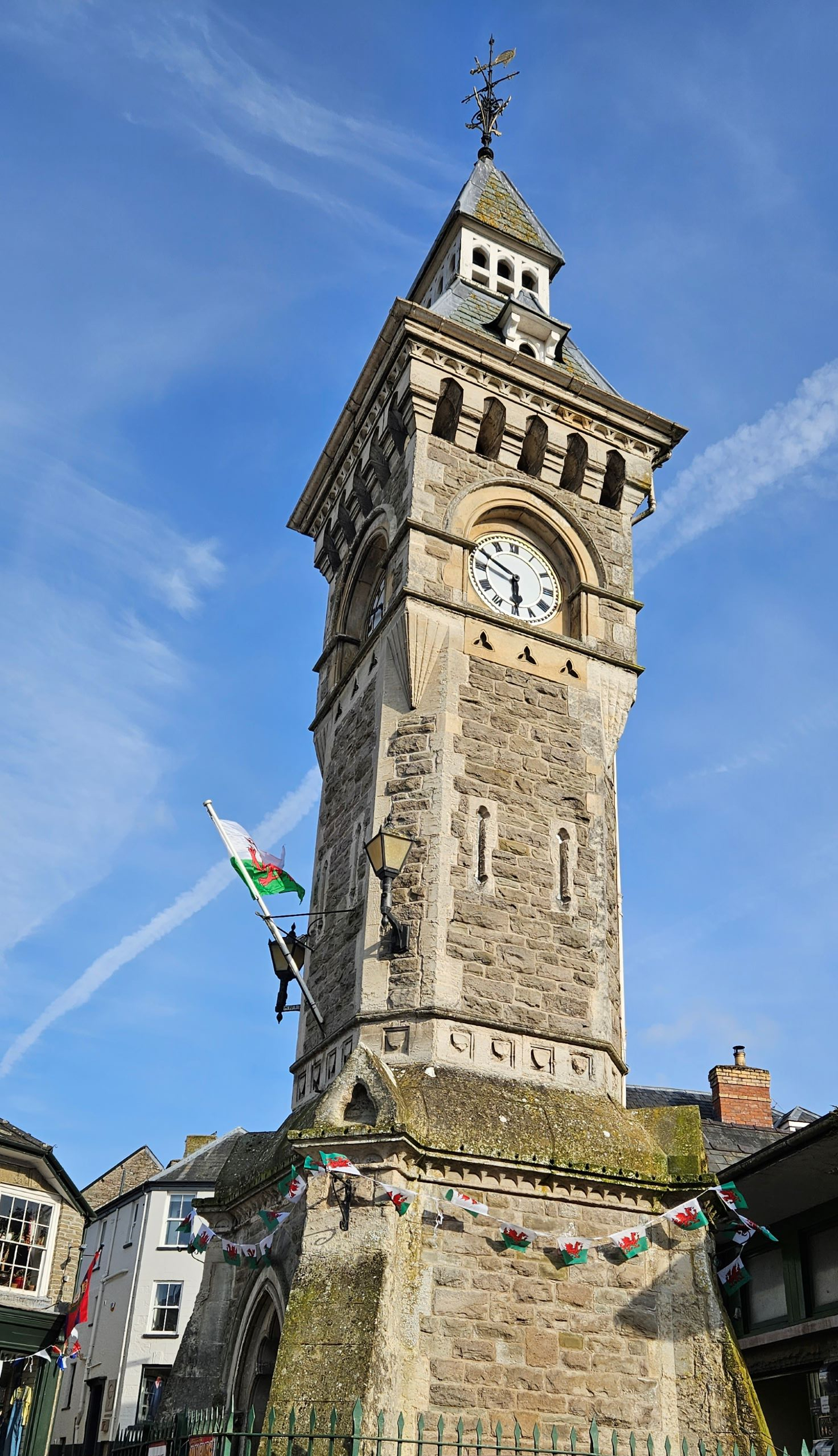 We resorted to window shopping and roaming the quaint streets, coming across an interesting clocktower, the remains of 12th century Hay Castle, which is now an arts center, and the River Wye.