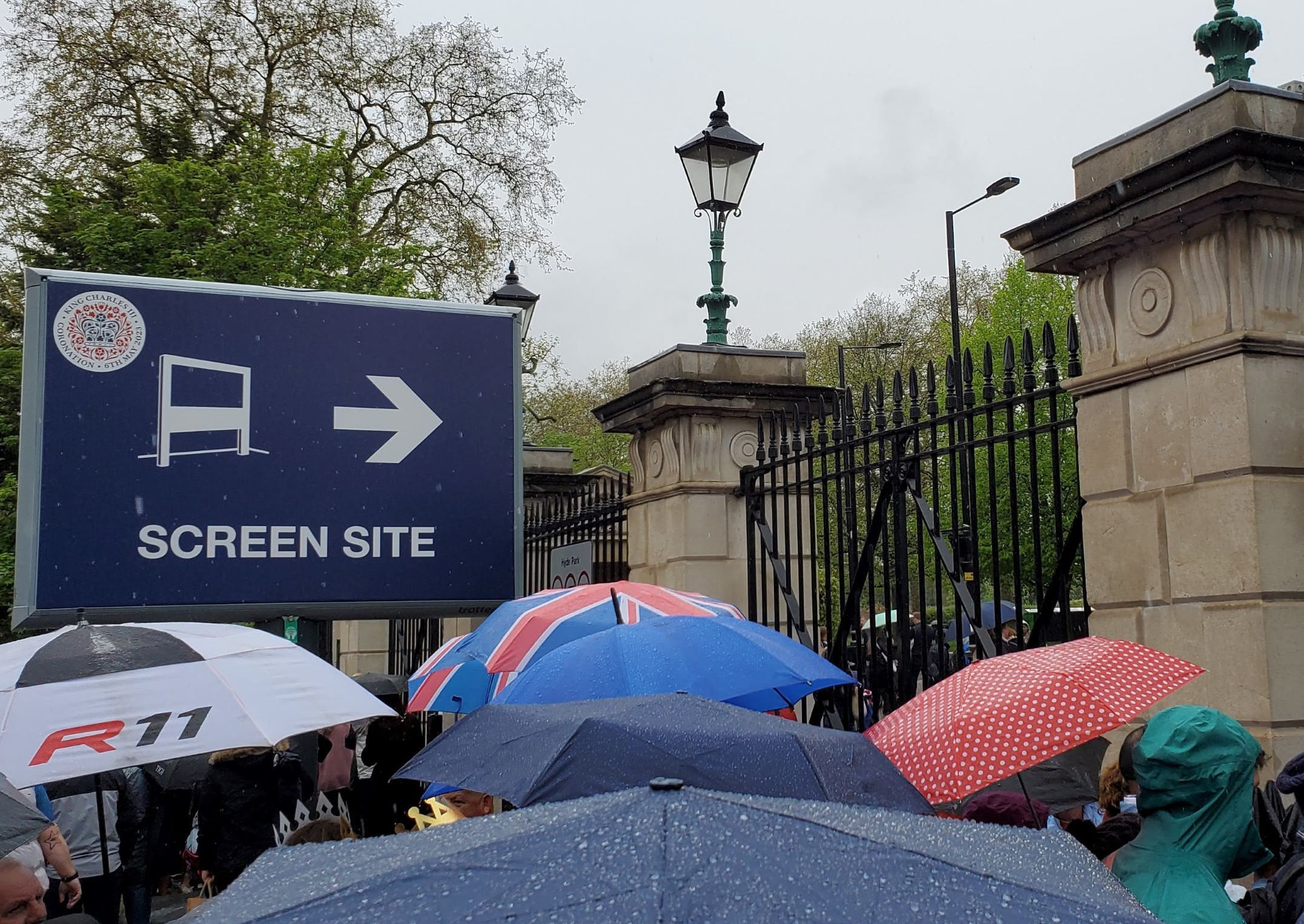 The morning of the Coronation ceremony we woke up early and rode the underground to Hyde Park. Our hotel was decked out in Coronation decor, and most people were dressed in red and blue or other celebratory regalia on the tube as we all disembarked and made our way toward the viewing areas.