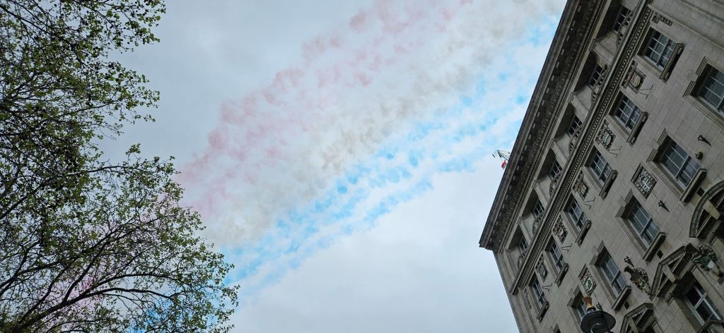 We left the crowd and walked north of the activities to try and circle around to the other side of Buckingham Palace. It was frustrating to continuously run into barricaded streets, but eventually we came to more open areas where we could temporarily enjoy all of the decor strung along the streets. We were also caught in a small crowd just as the flyover took place so we were able to pause, look up, and enjoy the colorful smoke trail the aircraft left in their wake.