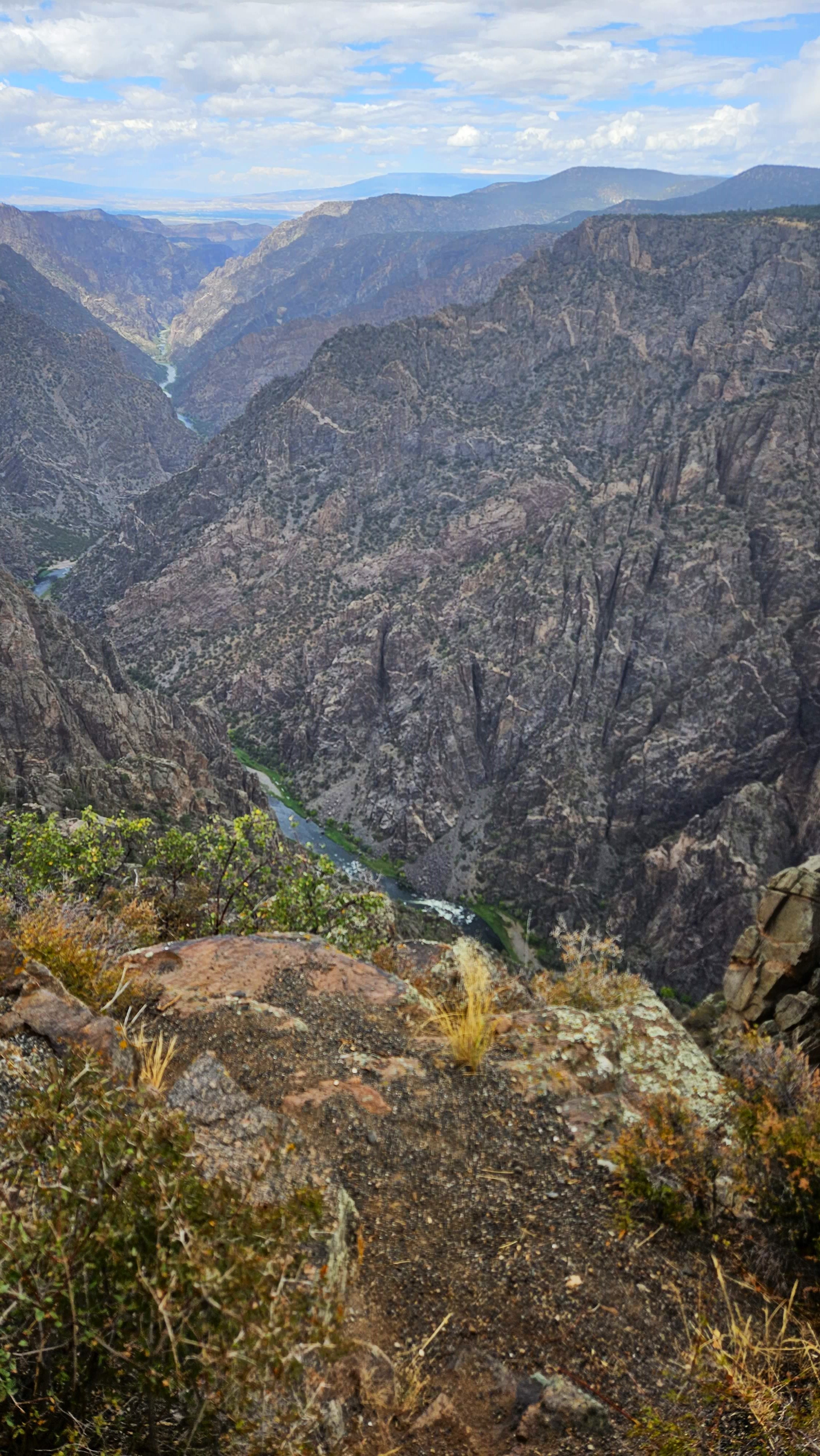 From the porch of the visitor center, you can catch a short path that winds down to Gunnison Point Overlook, which has even better visibility of the north rim cliffs and Gunnison River. We could also see the thunderstorm continuing its journey east in the distance.