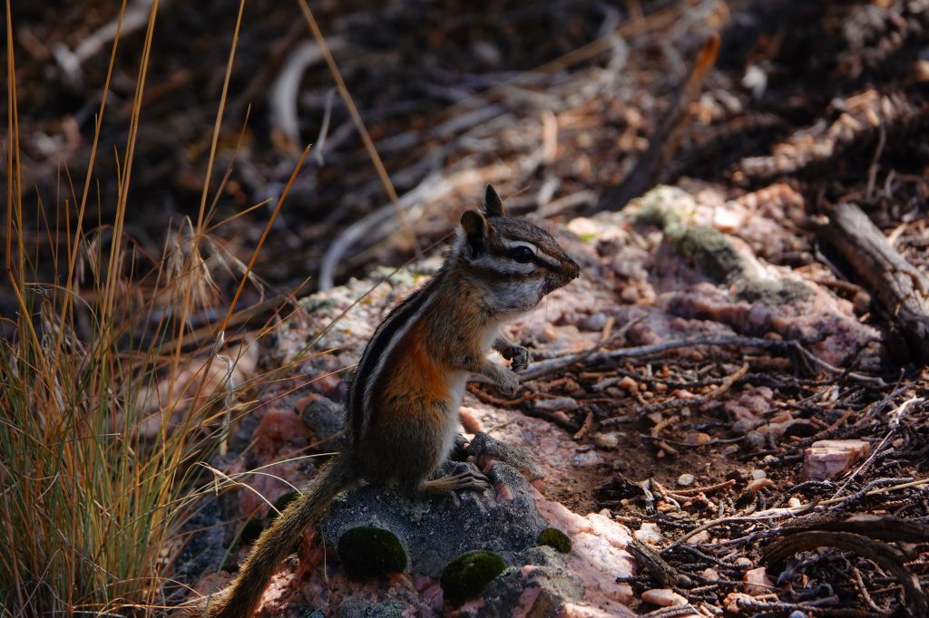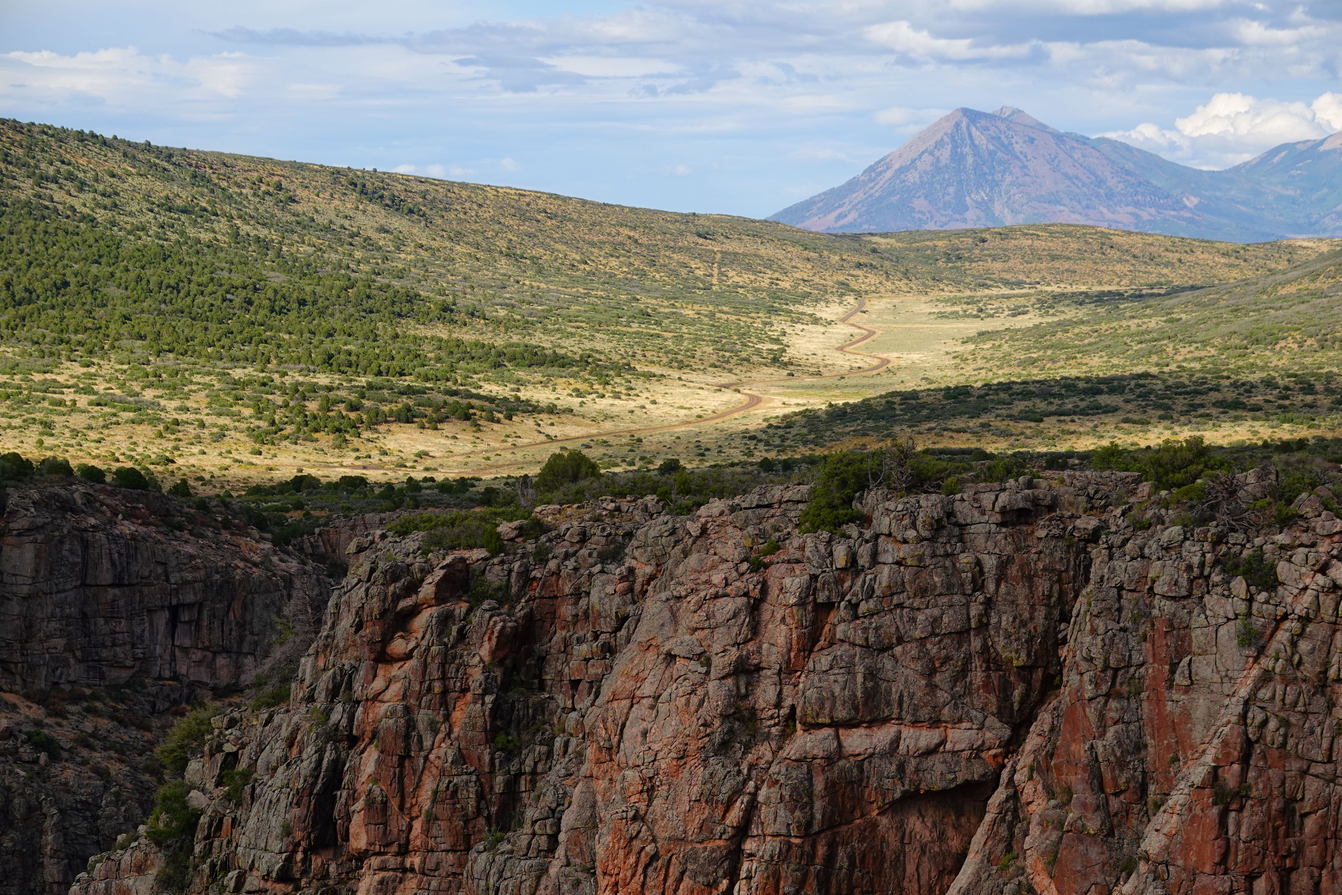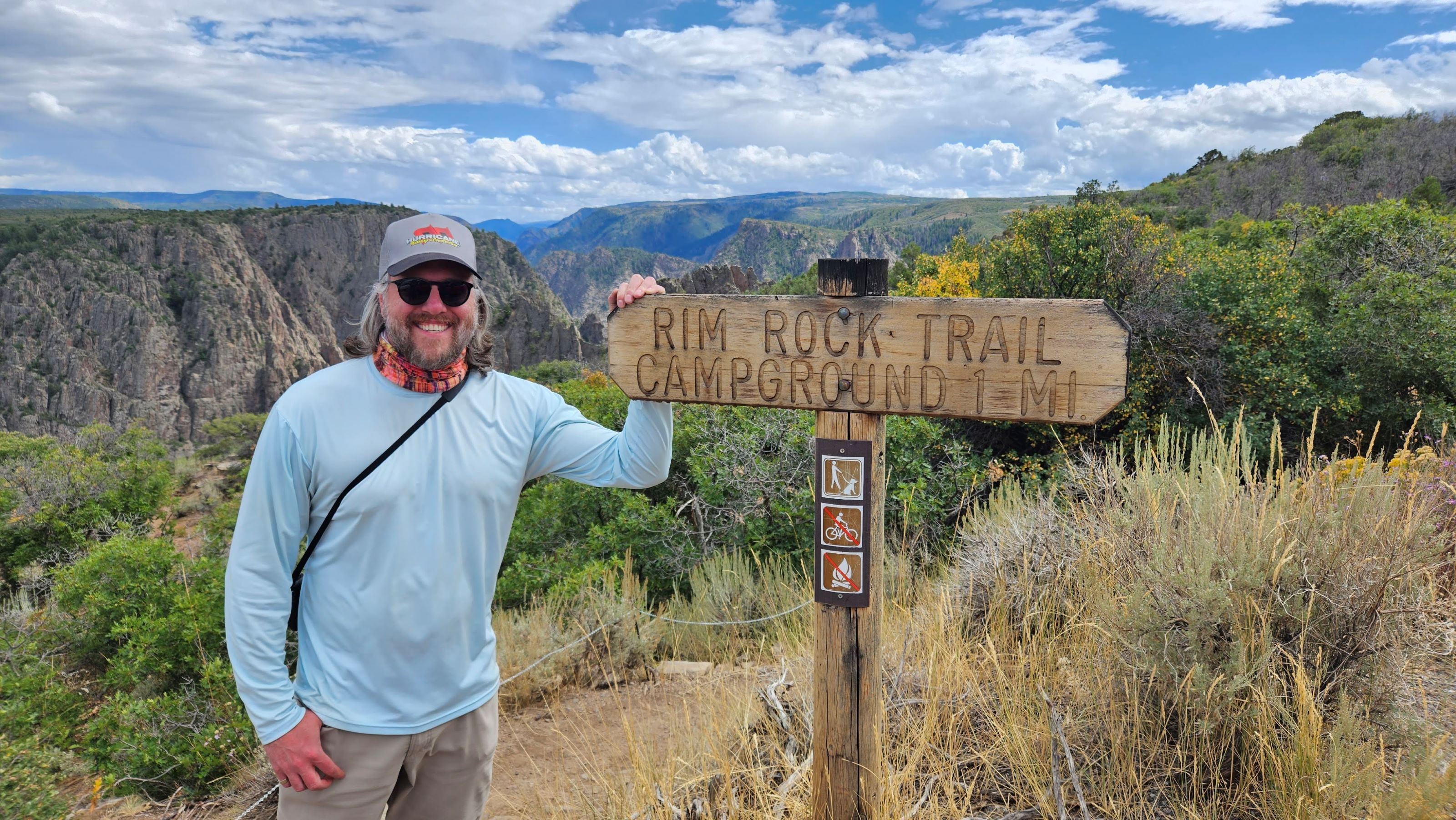 Brian made me stop along the road and take a photo with the sign for the next overlook – Cedar Point – for our family and friends in Ohio. This ended up being one of my favorite viewpoints because you have to walk a bit of trail from the road to the rim, and along the way there’s information about the local flora and fauna. We saw lots of flora but the only wildlife we spotted was a lone chipmunk who seemed to enjoy posing for the camera. The viewpoint itself was also one of the more interesting views of the Gunnison River – you could see almost a mile and half of water versus the brief glimpses we caught elsewhere.