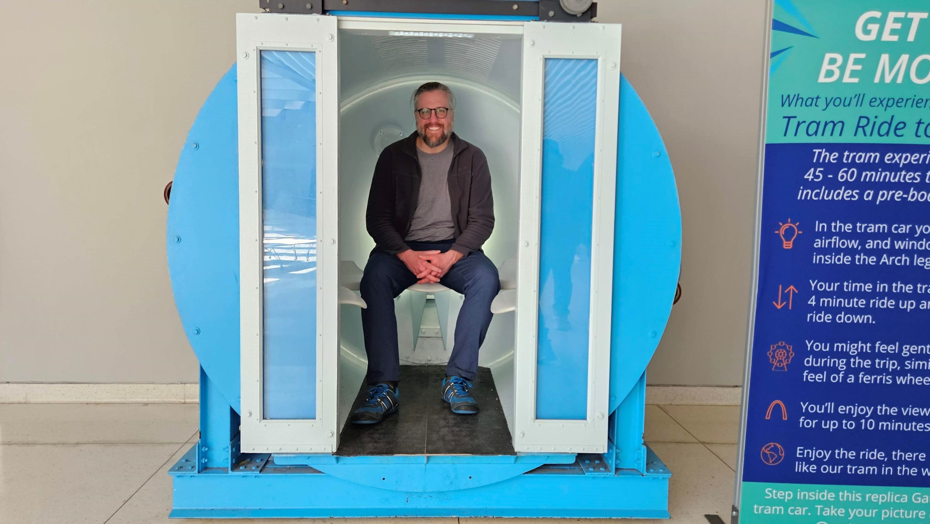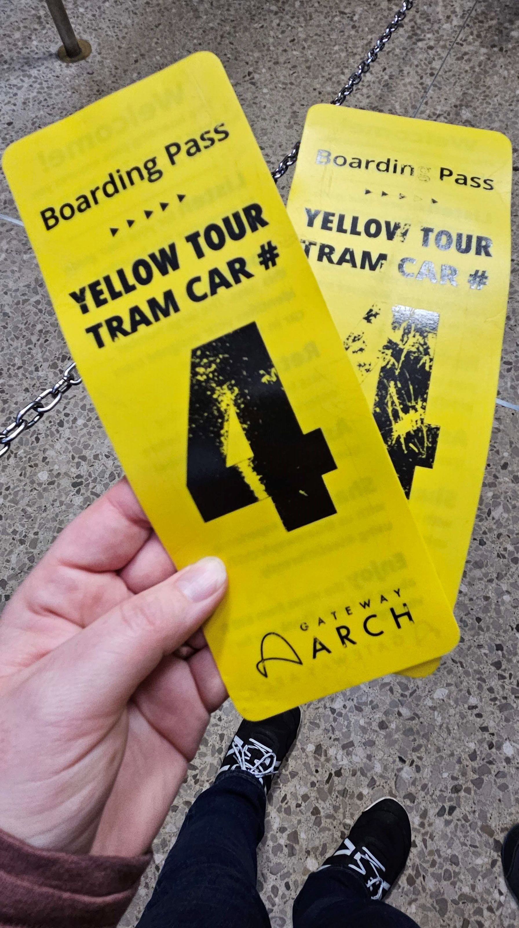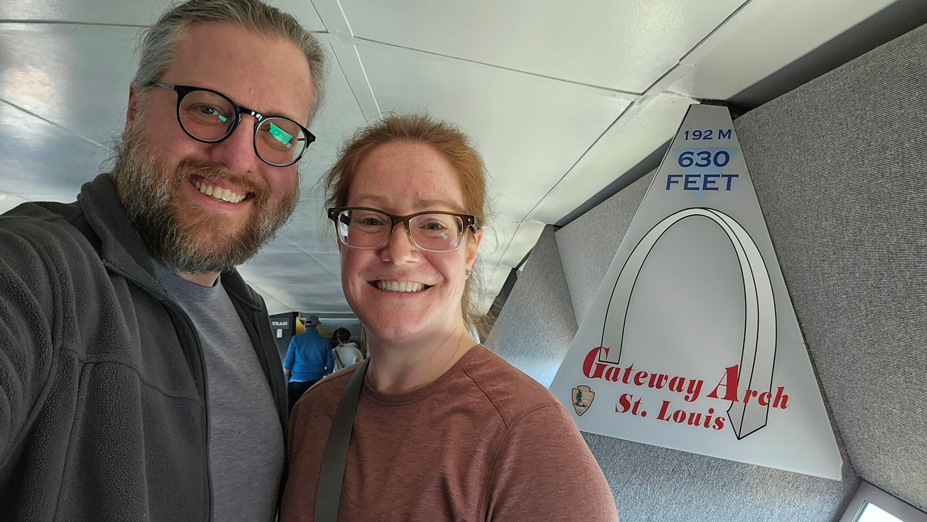 We made our way to the queue for our timed entry to the top. Each group has a park ranger assigned to it who covers some of the arch’s history as you move through several stations leading up to the trams. Along the way were information plaques as well as a short video we watched prior to boarding our 5-person tram car.