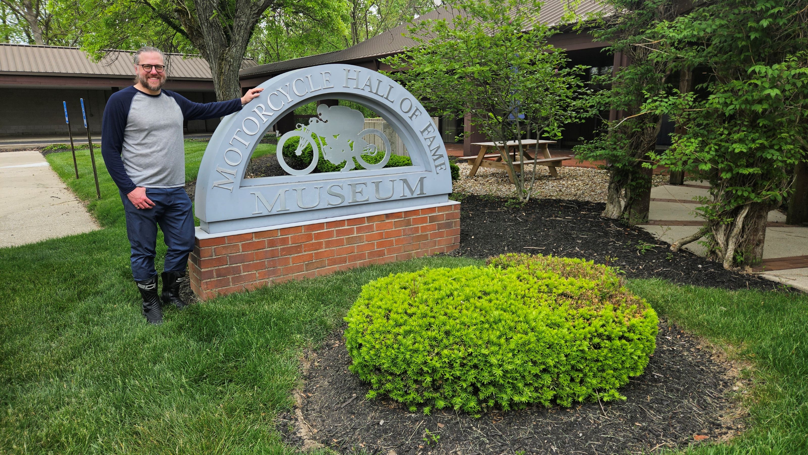 After passing through the brick AMA gates, we rode up the curvy driveway. Winding through lush green grass and trees, we followed signs for the Hall of Fame & Museum. Covered visitor motorcycle parking, complete with benches and lockers, was a welcome sight given the storm that we rode through to get there and the additional rain forecasted for that afternoon.