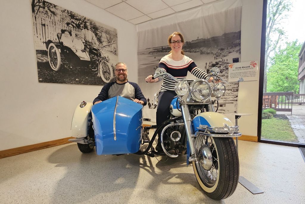 We headed downstairs, which had more bikes on display but with less information. It would be nice to know the historical importance of a given model in addition to its year, model, and displacement. It is a great opportunity to see many iconic motorcycles up close, and there is even a 1958 Panhead with sidecar that museum guests are allowed to sit on (see pic below).
