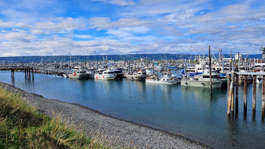 As luck would have it, the skies cleared temporarily for our walk around Homer’s harbor, which runs along a long, narrow spit. We rode to the farthest point, appropriately named ‘Land’s End,’ and then circled back to park in one of the many lots about halfway up the spit so we could take off our gear and walk around.