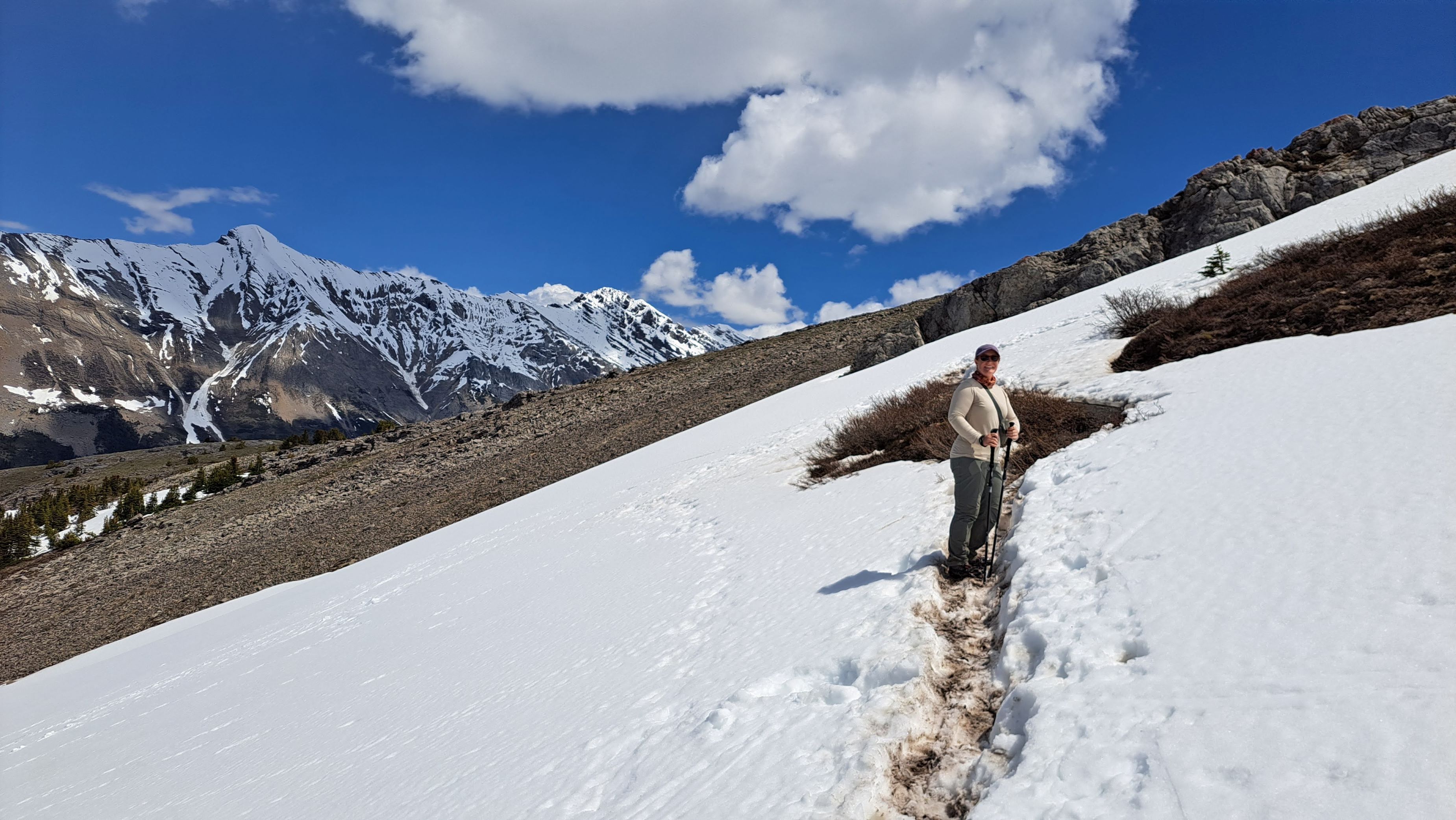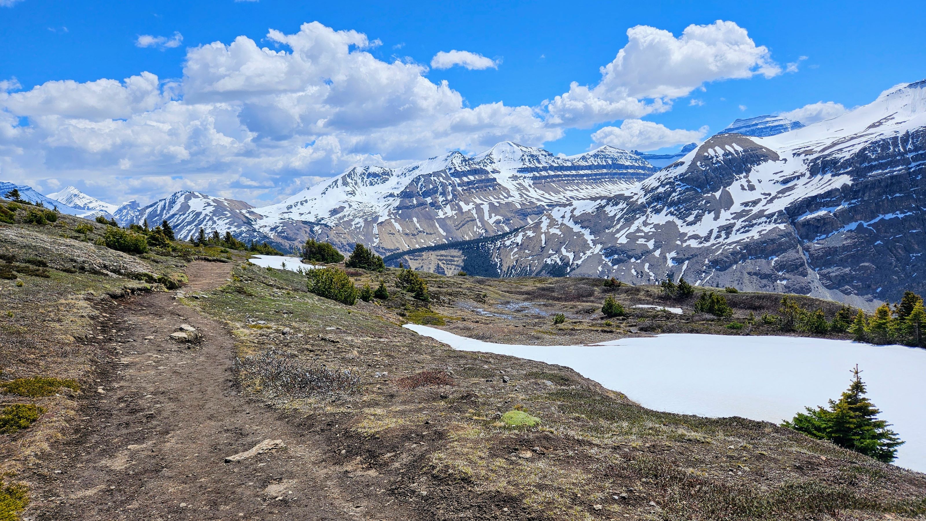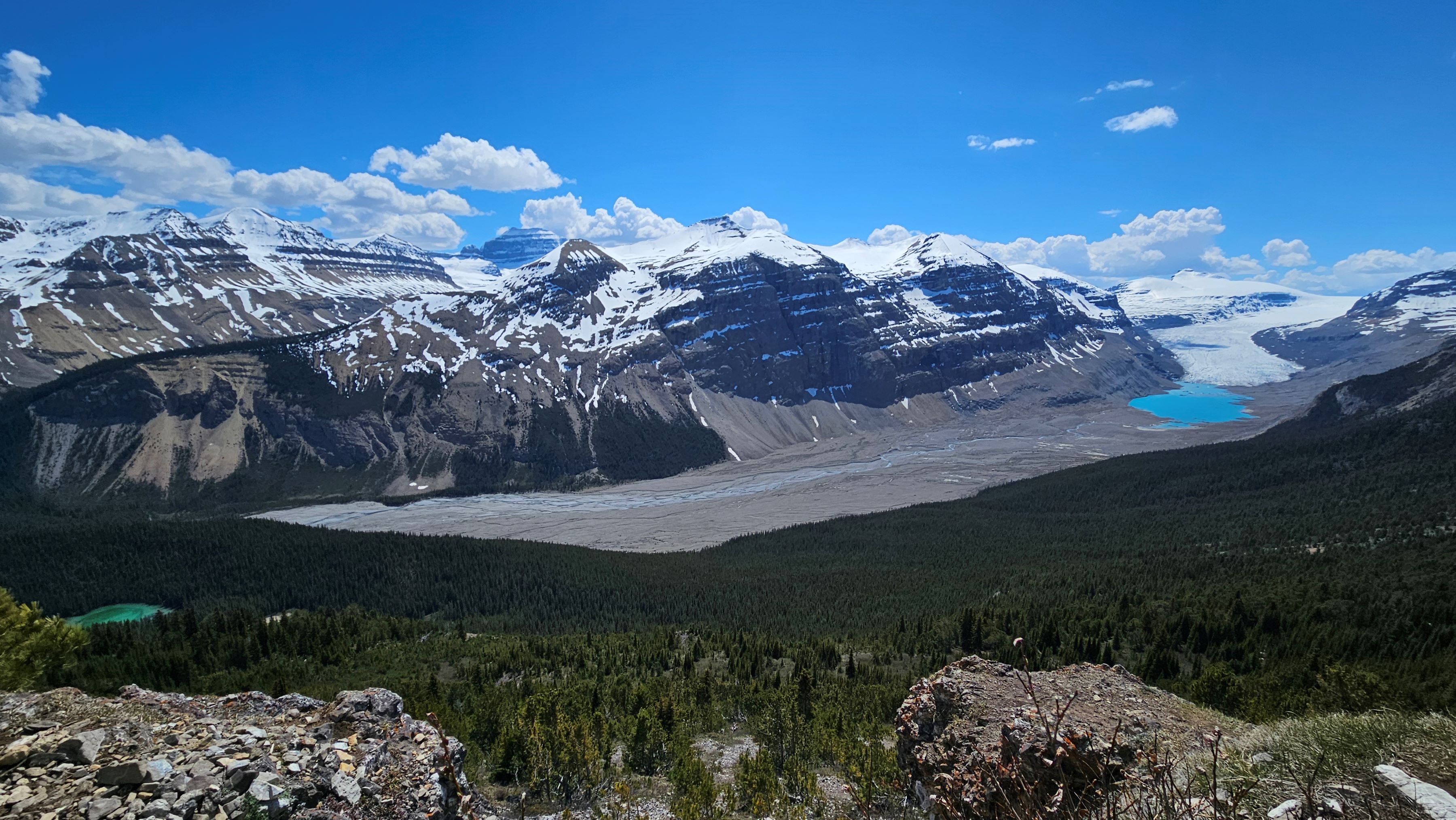 Happily, once we reached the trail summit, we were back on very obvious dirt trail. We continued to follow this relatively flat section of trail to its endpoint where we had stunning views of Saskatchewan Glacier.