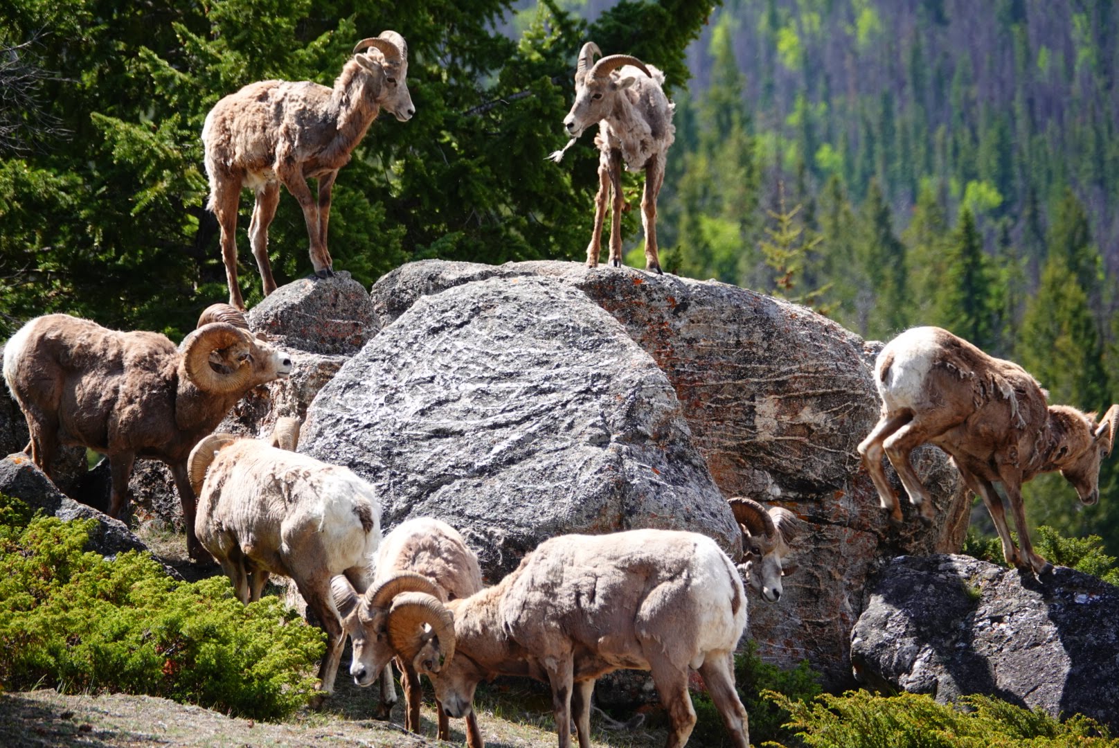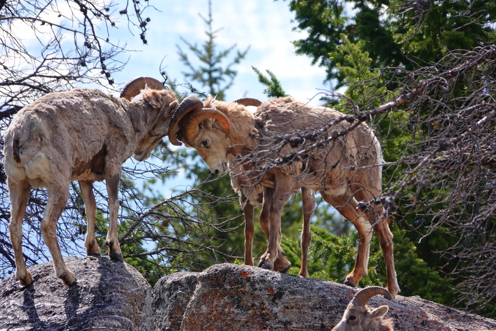 I was really glad Brian had the camera and could capture their antics from a safe distance. It was quite entertaining watching the juveniles headbutt one another from the top of a large rock, attempting to claim king of the hill while the stately – and much bigger horned – adults ignored their disputes.