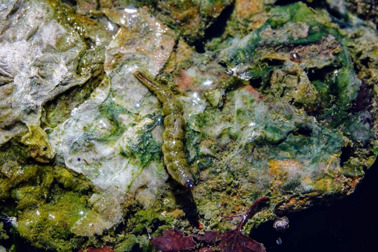 The snails are very tiny, and we couldn’t spot them until the ranger pointed one out to us. We also saw some of the tiny fish that have been introduced to these thermal waters as well as damselfly larvae that were in among the algae.