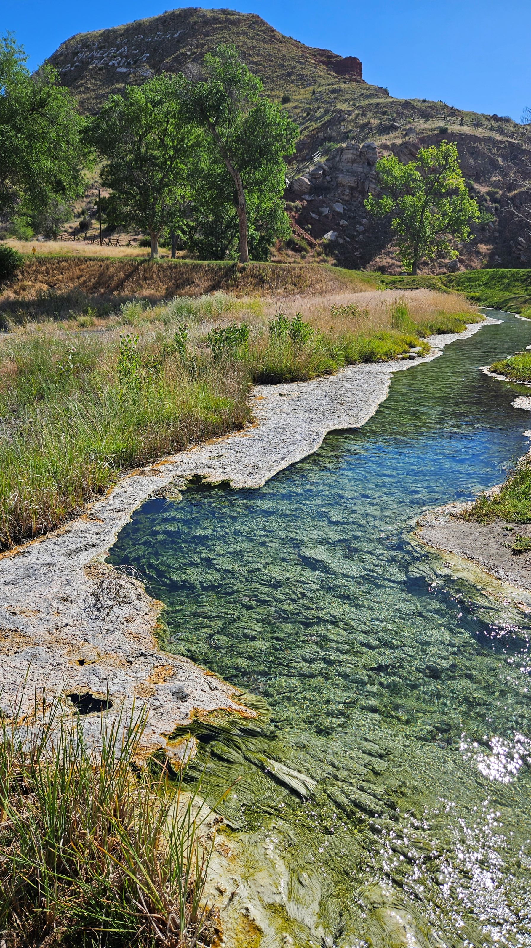 After a brief chat with the park staff we decided to park near the Koi pond so we could easily walk the Mineral Terrace boardwalk and cross over the Bighorn River via the park’s historic suspension bridge.