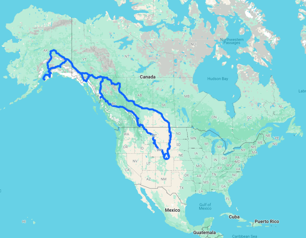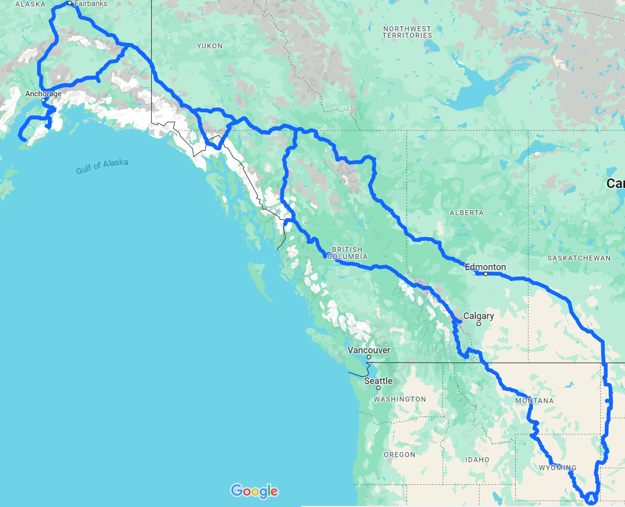 From a route standpoint, we decided to ride from Cheyenne, Wyoming, to the starting point of the Alaska Highway – which we took into Alaska – and then we returned via the Stewart-Cassiar Highway. We were able to ride the Golden Circle and the Beartooth Highway at different points on this trip as well. The trip ended up being 7,772 miles / 12,508 km and took us 38 days.