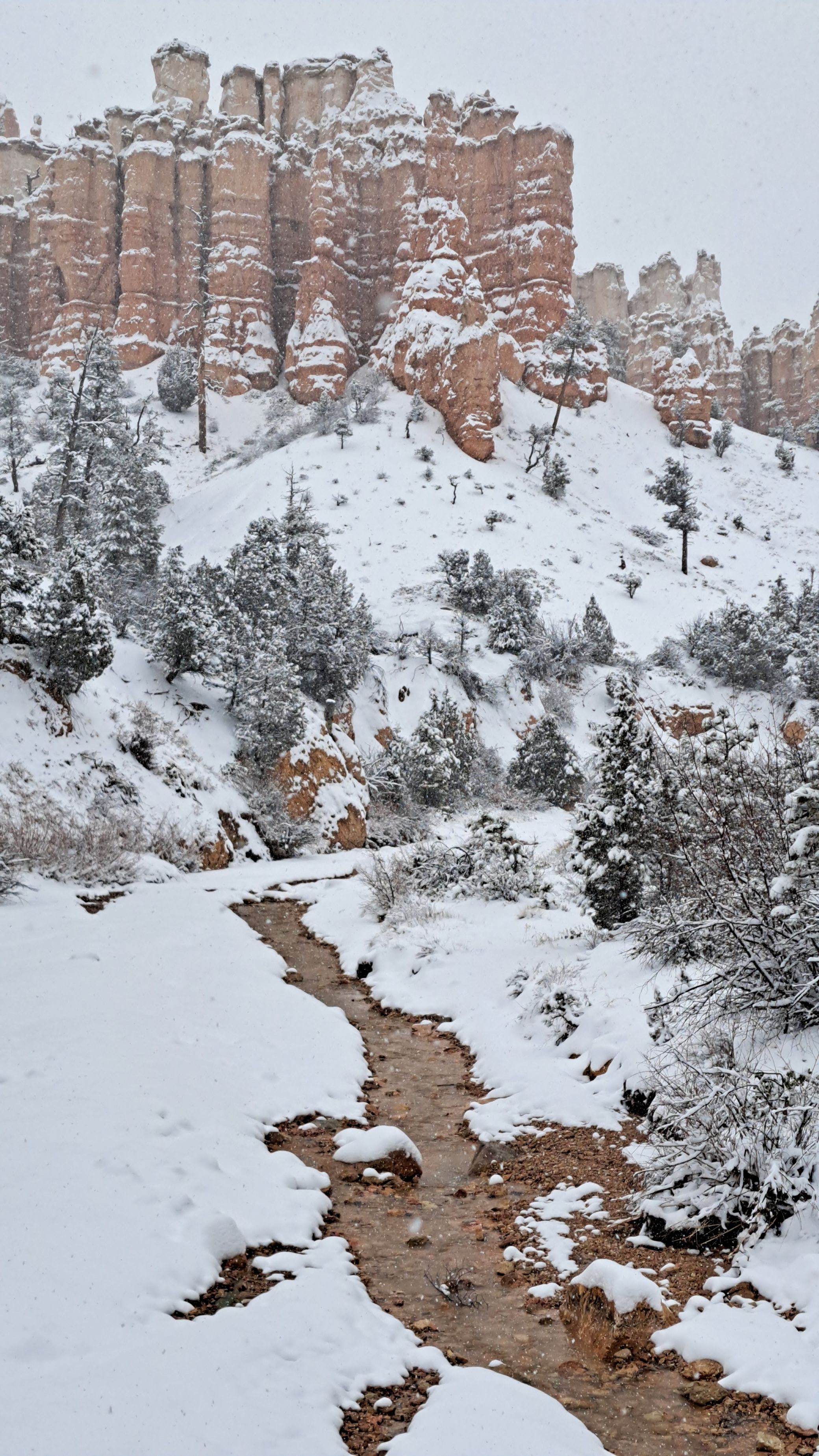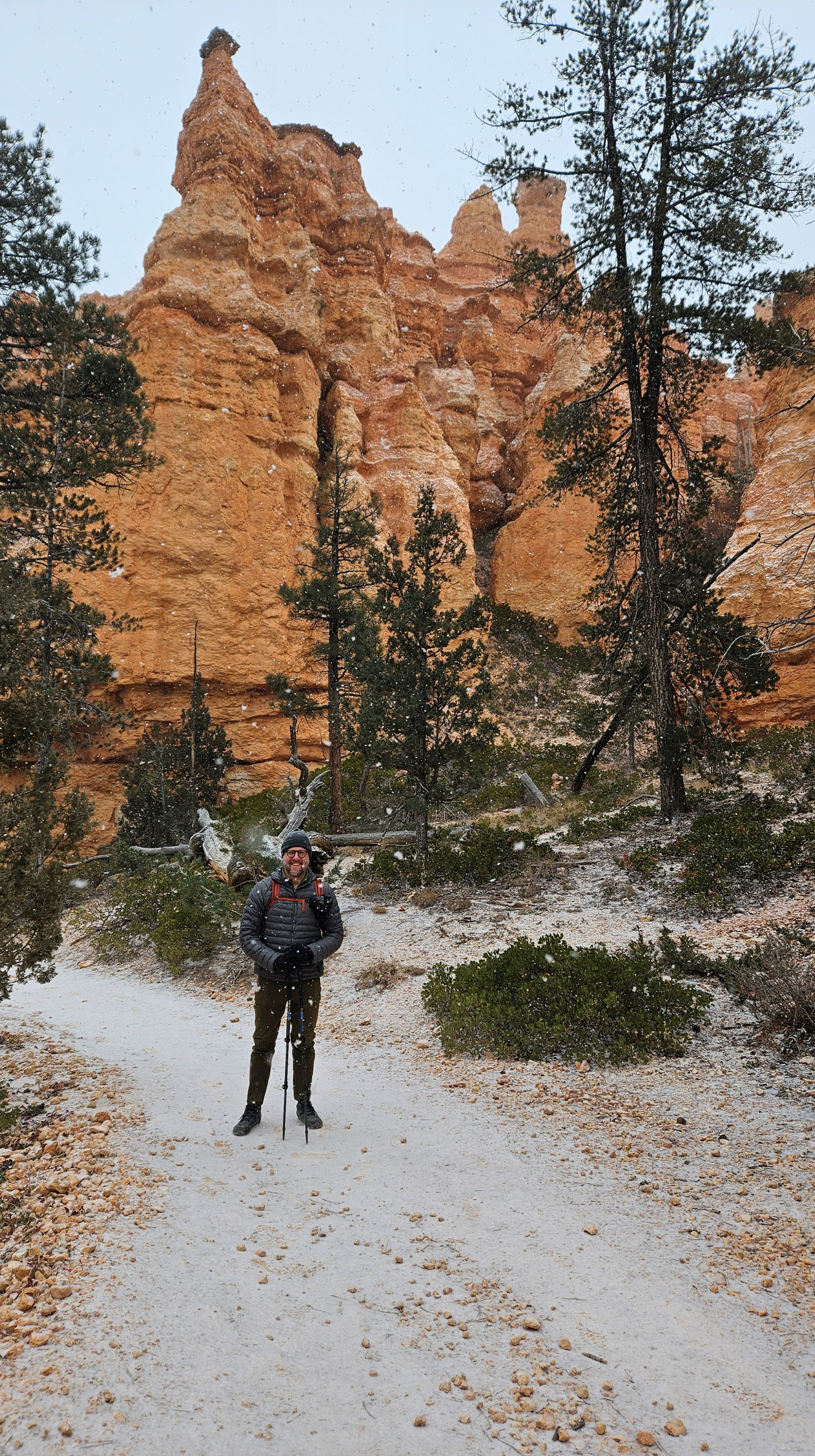 Our hike clocked in at 7.3 miles and 1,759 feet of gain. It was made even more spectacular by the large, soft flakes of snow that started falling shortly after we set out. I was glad we had our poles and ice spikes for a few sections where the accumulation covered slick ice on the rock. There were very few people out, resulting in a quiet and peaceful hike through the hoodoos.